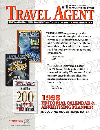 Folder component of Travel Agent Magazine's Annual Media Kit. Also indluced Folder, Rate Cards, and promotional material for the Universal Media Travel Group Publiccations and Divisions and sample magazines.