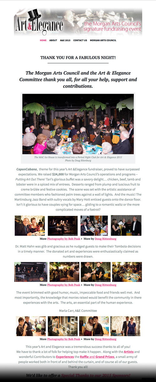 Art & Elegance 2015 - Charity Event Program Art & Elegance is an Annual fundraising event in support of the Morgan County WV arts copperative, the Morgan Arts Council. The 2015 event featured a theme based on the tropical style night club scene of the ledgenary Copacobana. Music and passion were always in fashion. The site is built in the CMS System Wordpress to allow the non-technical event comittee members the ability to modify and edit the site. Visit the Art & Elegance Web Site The event features contibutions of artwok by local and regional artists and experiencs provided by local businesses, raffled at the event, and raised over $24,000 for Morgan Arts Council’s operations and programs – Putting Art Out There! Includes Artwork and event Photography by Robert Peak and Doug Rittenburg. Display Typography and Additional Site Graphics by Kurt Griffith. WordPress CMS, Adobe Photoshop, Illustrator. |