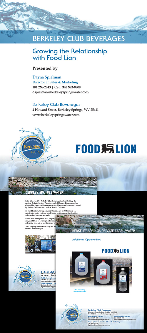 Berkeley Club Breverages / Berkeley Springs Water Sales presentation prefared for Spring Water bottler and distributor for a pitch to the regional Food Lion Grocery chain. Includes mock-up designs and renderings for Food Lion private labeling. Adobe InDesign, Photoshop, Illustrator, Acrobat, MS Word. |