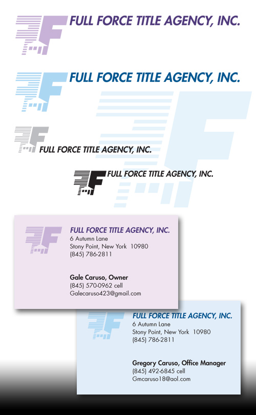 Full Force Title Agency / Logo Design & Business Identity, Fall 2012 InDesign, Photoshop, Illustrator, Acrobat. Logo Design for a local Real Estate Title Search firm. Done on a short budget with a shorter turnatound for the cards, we ran up the basic version for the business cards first, then completed the fullly rendered logos and usage guidance. The Agency’s name is a play on the owner’s nickname “Gale Force,̵ so the logo plays off that imagery. |