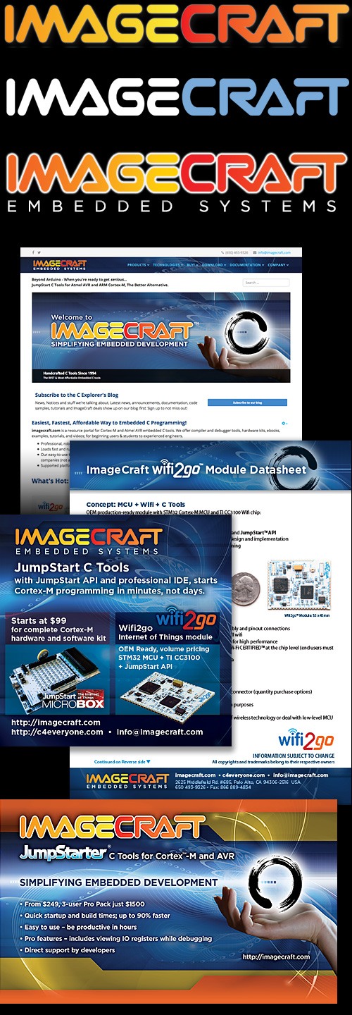 ImageCraft Embedded Systems - Business Identity Project Business Identity Project, incuding complete logo design, with additonal branding items. For a C-Focused, embedded technoogy company, a woman & minority-owned small business located in the heart of the Silicon Valley. Top to bottom: Logo designs, Joomla CMS Based Web Site, Sales Datasheet, Display Ad, Trade Show Booth Banner. Adobe Illustrator, Photoshop, InDesign, Acrobat, Dreamweaver, Text Editors, Joomla. |