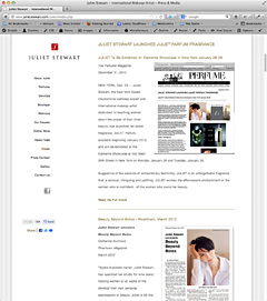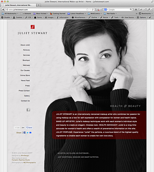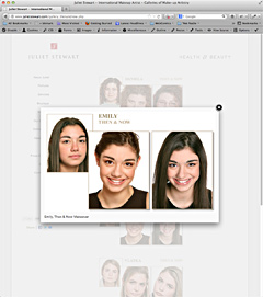 Juliet Stewart – International Makeup Artist Top: Home Page. Bottom: Gallery Page, Press & Media Page. Juliet Stewart's makeup boutique and service in Nyack, NY. In 2003 We built a simple but elegant website for her to promote her new venture. Over time the site has grown substantially and undergone several updates and redesigns. The site is now coded in PHP for swift modular updartes, incorporating CSS3, HTML4-5 JQiuery effects and interacticve elements, Facebook and PayPal shopping. Web Design and Administration. Dreamweaver, Textwrangler, Photoshop, Acrobat, inDesign |